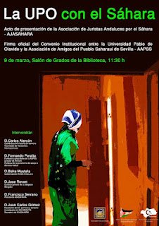 Hoy, 9 de marzo, se firmará el Convenio Institucional entre la Asociación de Amistad con el Pueblo Saharaui de Sevilla (AAPSS) y la Universidad Pablo de Olavide y se presentará la Asociación de Juristas Andaluces por el Sáhara – AJASAHARA.Desde la AAPSS y el grupo de estudios e investigación Saharupo de la Universidad Pablo de Olavide, perteneciente al Laboratorio de Ideas y Prácticas Políticas -LIPPO-, nos complace invitaros al acto, que se realizará en el edificio 25b, Salón de Grados de la Biblioteca a las 11.30h.