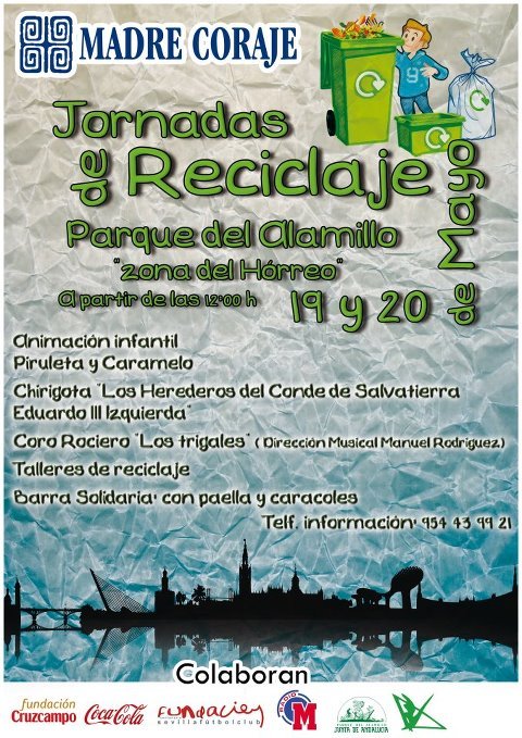 Jornadas de Reciclaje en el Parque del Alamillo, organizadas por Madre Coraje-Delegación de Sevilla, que tendrán lugar los días 19 y 20 de mayo.