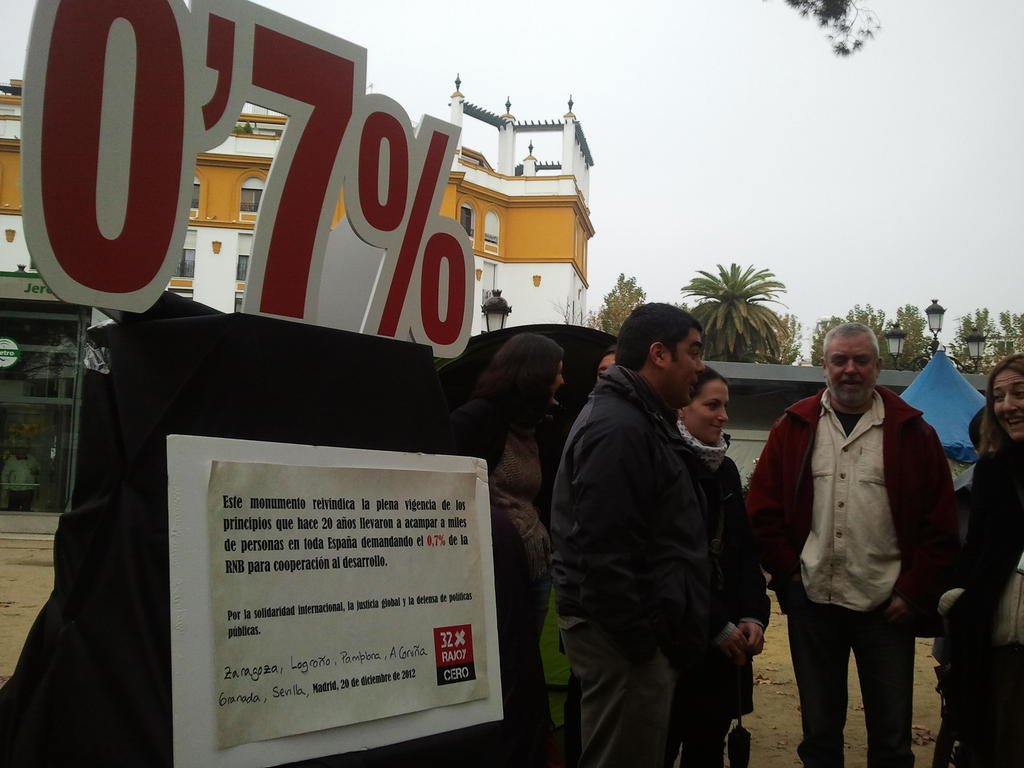 Al igual que en Madrid, Zaragoza, Logroño, Pamplona, Coruña y Granada, en Sevilla la Coordinadora Andaluza de ONGD ha inaugurado en Sevilla un monumento a la lucha ciudadana a favor de la histórica cifra del 0,7% y ha realizado una acampada simbólica en los Jardines de Cristina, lugar en el que se acampó por este motivo en 1994.