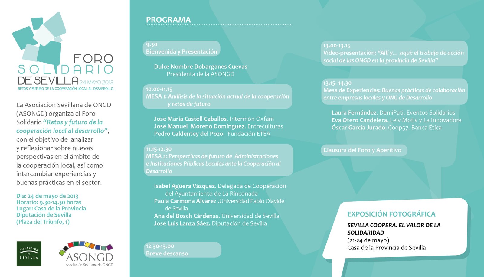 El Foro, que tendrá lugar el 24 de mayo en la Casa de la Provincia de Sevilla (Plaza del Triunfo, 1), estará organizado en tres mesas en las que participarán diferentes agentes de la cooperación local al desarrollo, dando su punto de vista acerca de los retos del sector en un delicado momento y ofreciendo alternativas para afrontarlo. Descargar Programa del Foro.