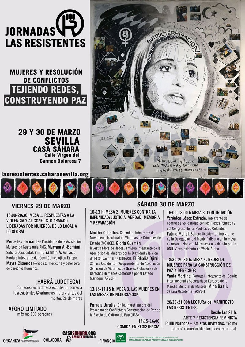 La Asociación de Amistad con el Pueblo Saharaui de Sevilla (AAPSS) organiza las primeras Jornadas internacionales Las Resistentes. Mujeres y Resolución de conflictos. Tejiendo redes, construyendo paz financiadas por la Agencia Andaluza de Cooperación Internacional para el Desarrollo (AACID). Se celebrarán el próximo viernes 29 de marzo y sábado 30 de marzo en Casa Sáhara (Virgen del Carmen Dolorosa, 7. Sevilla). Estas jornadas forman parte del proyecto de formación feminista Las Resistentes.