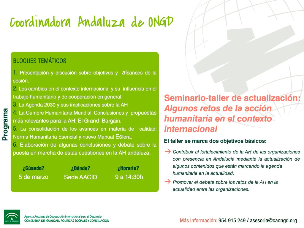 La Coordinadora Andaluza de ONGD organiza un taller formativo, titulado Algunos retos de la acción humanitaria en el contexto internacional. Tendrá lugar el próximo 5 de marzo en la sede de la AACID (Avenida de al Palmera 24, Sevilla), en horario de 9 a 14.30 horas. Para complementar el programa la Agencia hará una breve intervención para trasladar las líneas generales de la acción humanitaria en el marco del nuevo PACODE.
