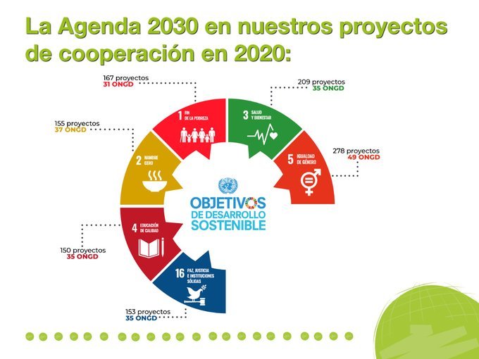 El trabajo de las ONGD andaluzas se enmarca, tanto en Andalucía como en otros países, en la Agenda 2030. Todas las intervenciones se vinculan a uno o varios de los 17 Objetivos de Desarrollo Sostenible que la integran. Entre los proyectos de cooperación internacional, destaca el ODS 5 (Igualdad de género), presente en el 59% de ellos y guía de actuación para el 84% de las ONGD. Por motivos obvios, la pandemia ha motivado que el ODS 3 (salud) esté presente en el 44% de los proyectos. Otros ODS que cobraron relevancia en esta labor fueron el 1 (erradicación de la pobreza), el 2 (lucha contra el hambre) o el 4 (educación de calidad).