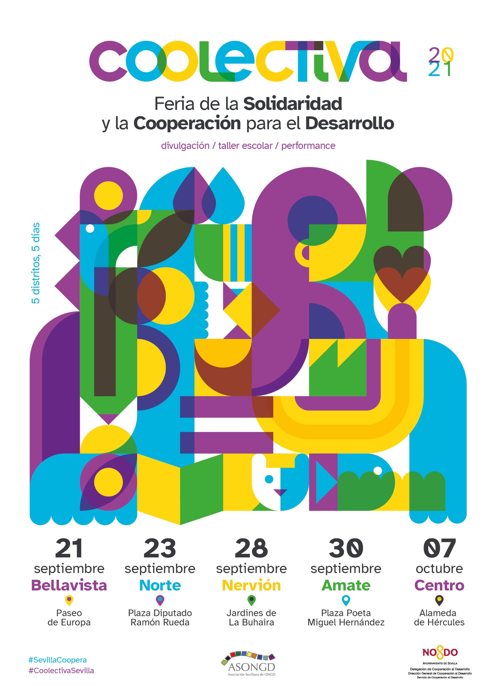 Coolectiva es un espacio de encuentro itinerante en Sevilla en torno a la cooperación para el desarrollo en las siguientes fechas y distritos: 21 de septiembre: Distrito Bellavista / La Palmera: Paseo de Europa; 23 de septiembre: Distrito Norte: Plaza Diputado Ramón Rueda; 28 de septiembre: Distrito Nervión: Jardines de La Buhaira; 30 de septiembre: Distrito Cerro / Amate: Plaza Poeta Miguel Hernández; 7 de octubre: Distrito Casco Antiguo: Alameda de Hércules. En todos los enclaves, el horario de visita será de 10:00 a 20:00 horas