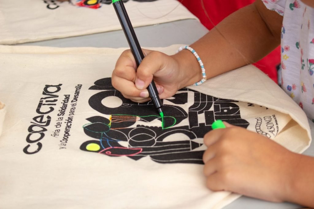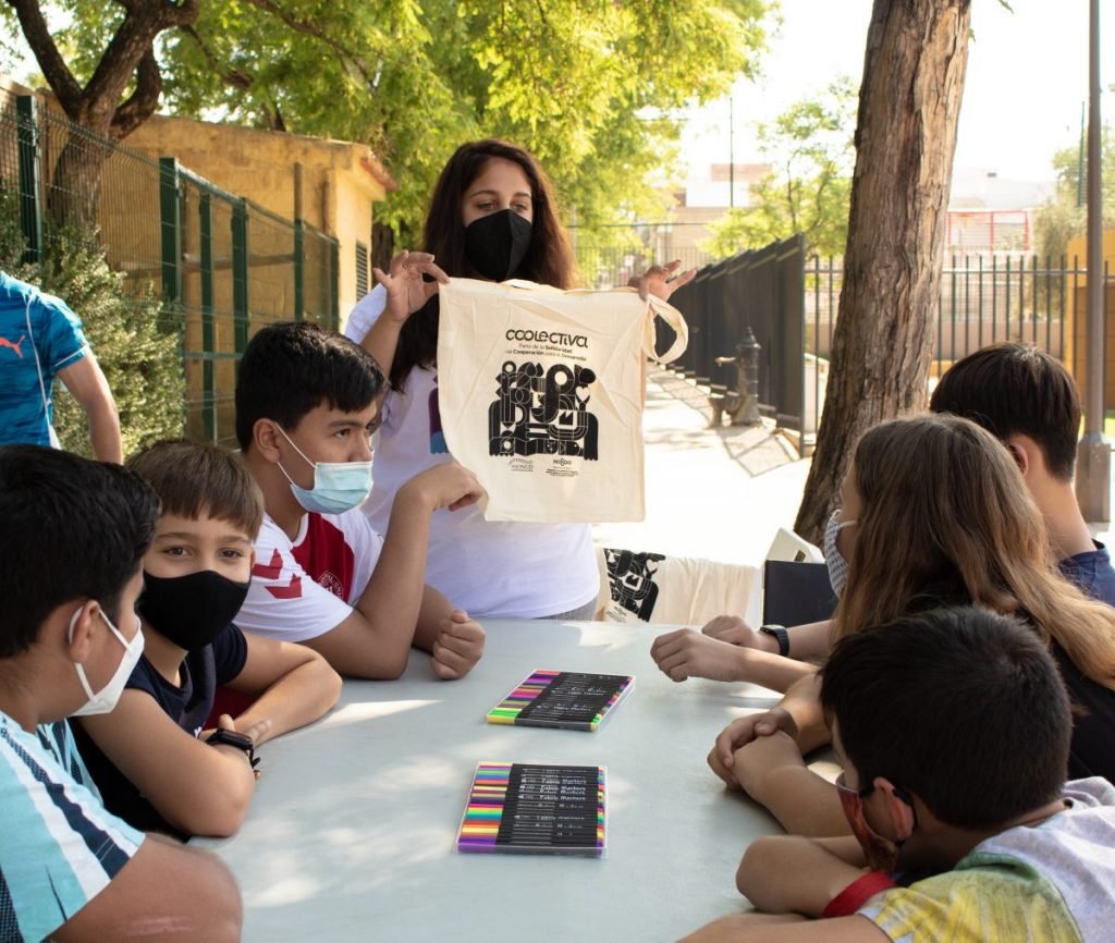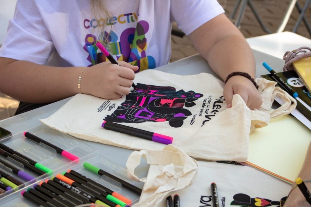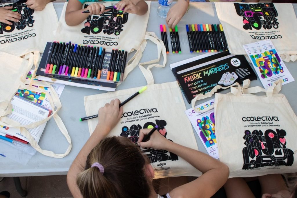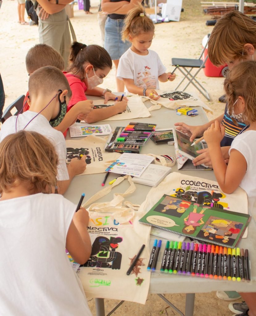 En horario de tarde y aprovechando que todas las localizaciones se emplazaban en parques y plazas públicas, hemos invitado a los más peques a sentarse con nosotras a personalizar bolsas de Coolectiva o acercarnos a los ODS.
