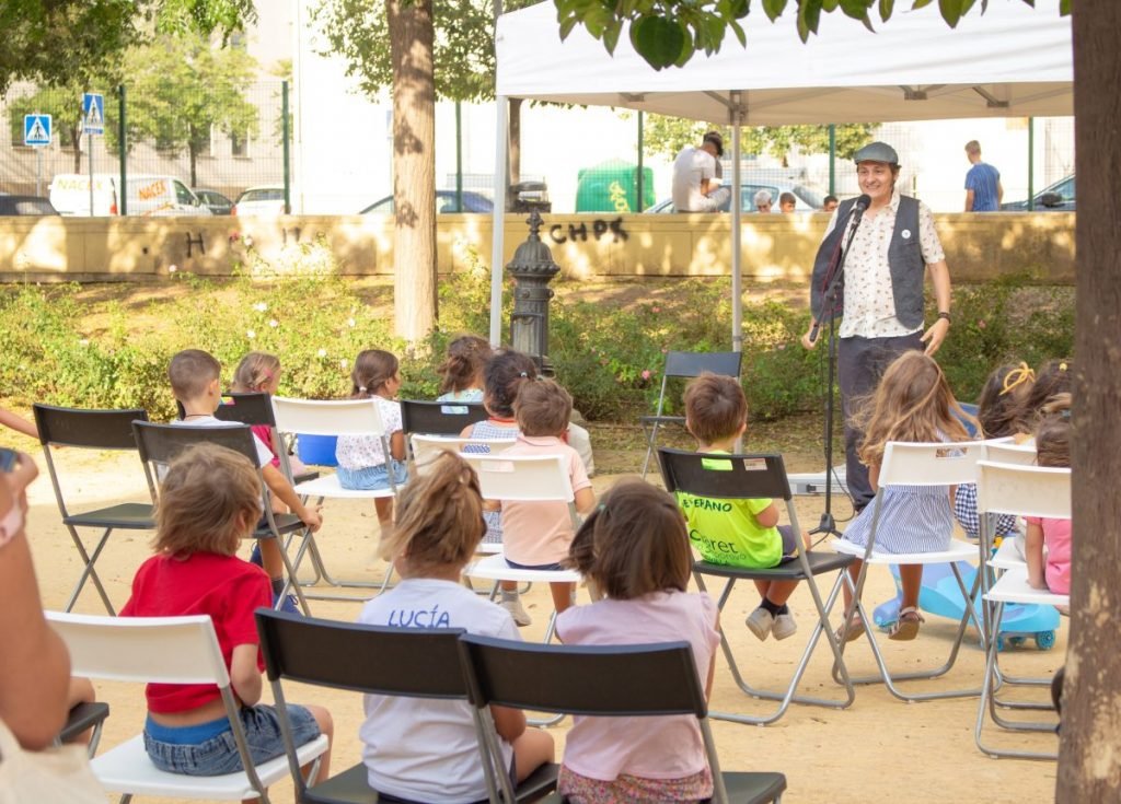 El formato de la jornada, que se ha replicado en los cinco distritos, nos ha permitido la realización de minitalleres y actividades con los grupos escolares durante las mañanas, una actividad de narración oral todas las tardes, dirigida especialmente a los más pequeños y el diálogo e intercambio de información con el público en general que se ha acercado a nuestros stands durante todo el día.
