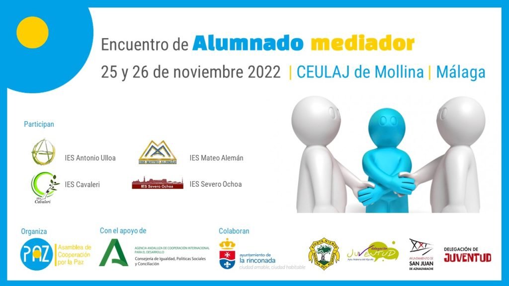 Esta iniciativa se llevará a cabo en el Centro Eurolatinoamericano de Juventud (CEULAJ) en Mollina, Málaga y está incluida dentro del proyecto “Escuelas sin Racismo, Escuelas para el Desarrollo: Impulso de la participación social andaluza a través de la gestión equitativa de grupos en la comunidad educativa” con el que Asamblea de Cooperación Por la Paz ACPP pone a disposición del alumnado mediador y el profesorado la formación en técnicas de mediación, resolución de conflictos y gestión de grupos.