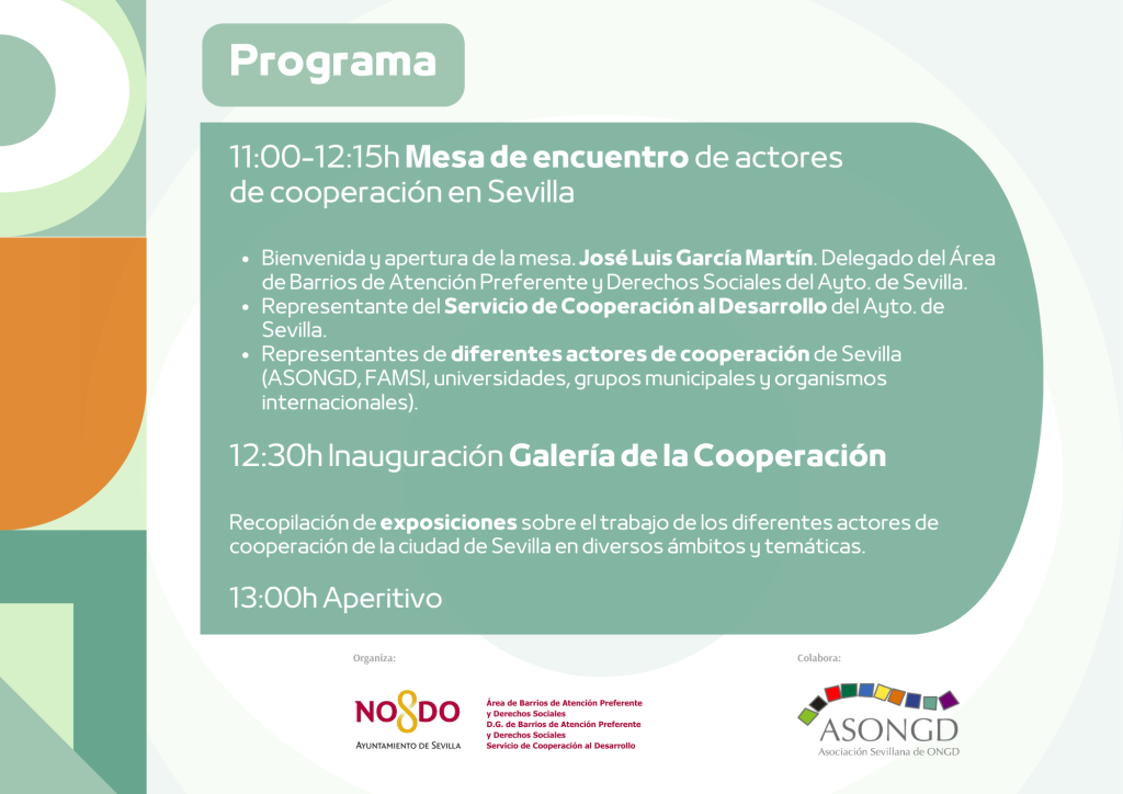 Con motivo del Día de la Persona Cooperante que se celebra cada año el 8 de septiembre, el Área de Barrios de Atención Preferente y Derechos Sociales del Ayuntamiento de Sevilla, a través del Servicio de Cooperación al Desarrollo, en colaboración con la Asociación Sevillana de ONGD (ASONGD), organiza un acto conjunto para hacer visible la labor de cooperación para el desarrollo que realizamos diferentes