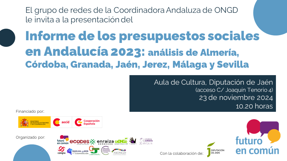 El próximo sábado 23 de noviembre, dentro del encuentro del grupo de trabajo de redes, se presentará el Informe de los presupuestos sociales en Andalucía 2023: análisis de Almería, Córdoba, Granada, Jaén, Jerez, Málaga y Sevilla. Se trata de parte del trabajo en este año de nuestras plataformas provinciales de ONGD en el marco del proyecto con Futuro en Común.