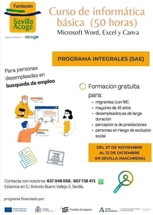 La Fundación Sevilla Acoge abre nueva edición del Curso de Informática básica para personas desempleadas en búsqueda activa de empleo . El curso es gratuito y te asesoraran para que tu búsqueda de empleo sea más efectiva y culmine con un empleo estable.