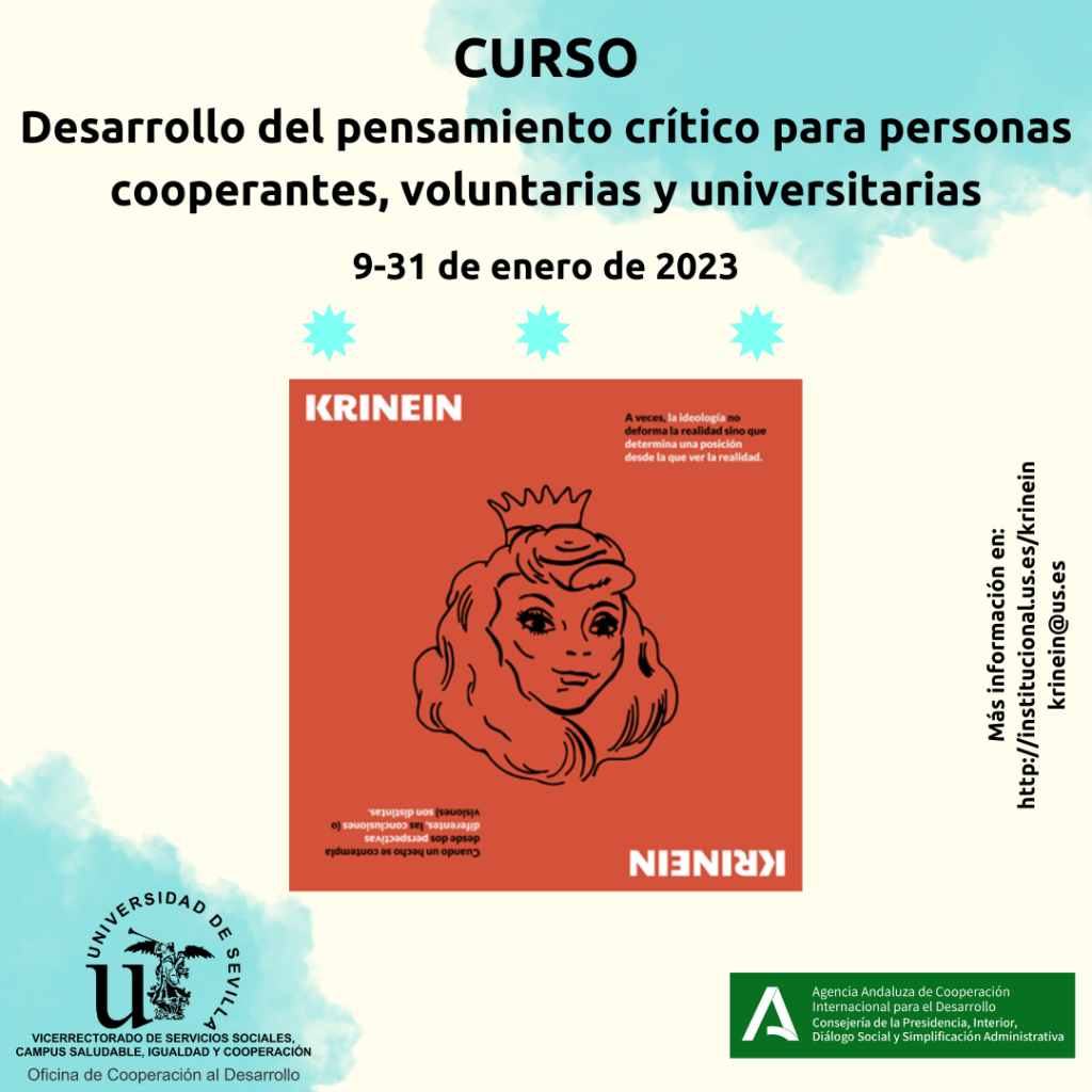 Este curso está organizado por la Oficina de Cooperación al Desarrollo de la Universidad de Sevilla y el proyecto KRINEIN, financiado por la Agencia Andaluza de Cooperación Internacional para el Desarrollo (Expte. 2020UE003 Fortalecer las capacidades de pensamientos críticos, alternativos y de habilidades sociales de la comunidad universitaria y de otros actores de la cooperación andaluza para el ejercicio responsable de la ciudadanía global).