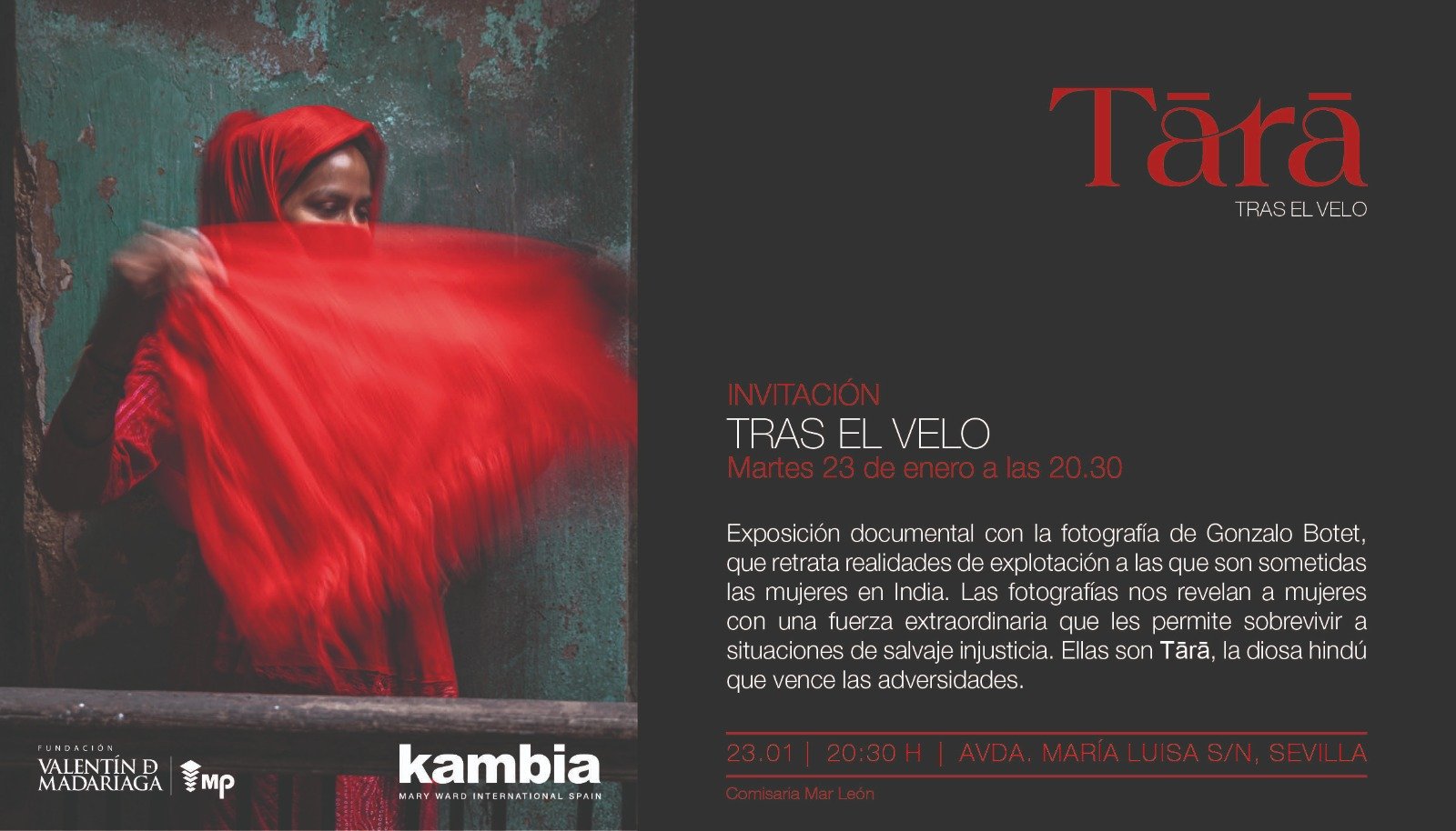 El próximo martes 23 de enero, la Fundación KAMBIA inaugura «Tārā. Tras el velo«, la exposición documental de Gonzalo Botet que retrata realidades de explotación a las que son sometidas las mujeres en India. Las fotografías nos revelan a mujeres con una fuerza extraordinaria que les permite sobrevivir a situaciones de salvaje injusticia. Ellas son Tārā, la diosa hindú que vence las adversidades.
