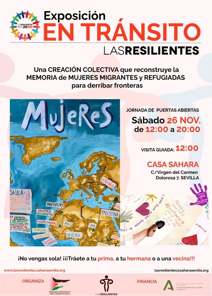 La Asociación de Amistad con el Pueblo Saharaui de Sevilla organiza la exposición En Tránsito, una muestra creada de forma colectiva por mujeres migrantes, refugiadas y acogedoras que narra las historias de tránsito de las mujeres que migran: los motivos que las obligan a iniciar el proyecto migratorio o el refugio, sus rutas, sus duelos, sus derechos vulnerados, sus sueños…