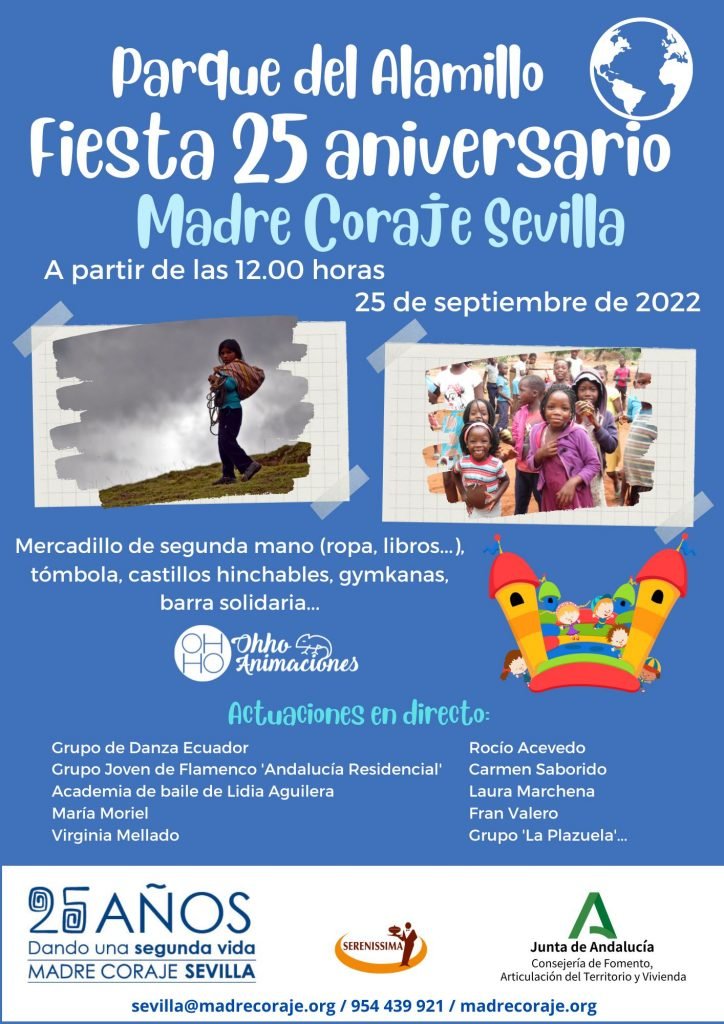 El próximo 25 de septiembre a partir de las 12:00h en el Parque del Alamillo, la organización Madre Coraje en Sevilla celebra su 25 aniversario con una Fiesta que ofrecerá una gran variedad de actividades y actuaciones para todos los públicos.