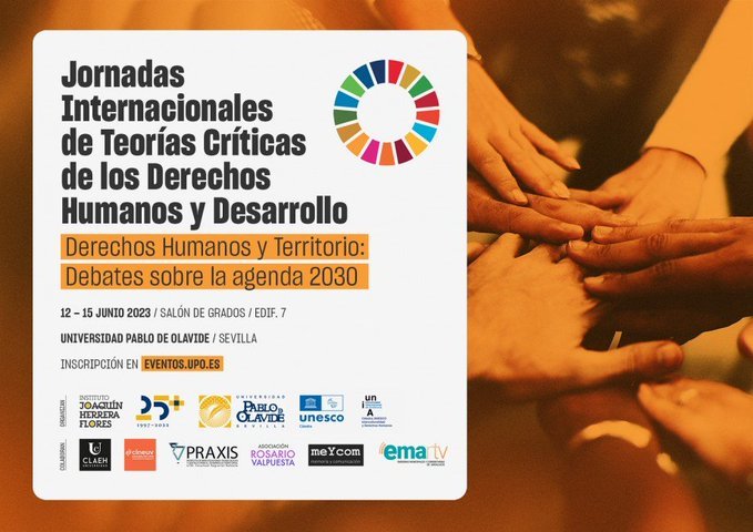La oficina de Relaciones Internacionales y la Maestría en Derechos Humanos, Interculturalidad y Desarrollo (UPO-UNIA) con el apoyo del Instituto Joaquín Herrera Flores – España y América Latina organizan la 1ª edición de las Jornadas Internacionales de Teorías Críticas de los Derechos Humanos y desarrollo, con el tema “Agenda 2030, derechos humanos y territorio”, los días 12, 13, 14 y 15 de junio de 2023. El evento tendrá lugar en la Universidad Pablo de Olavide de Sevilla.