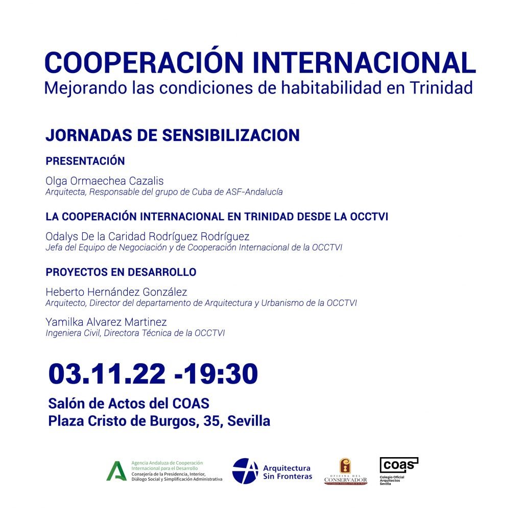 Arquitectura Sin Fronteras organiza en Sevilla las jornadas de sensibilización Cooperación Internacional. Mejorando las condiciones de habitabilidad en Trinidad el próximo 3 de noviembre a las 19:30h en el Salón de Actos del COAS (Plaza Cristo de Burgos, 35), con el siguiente programa: