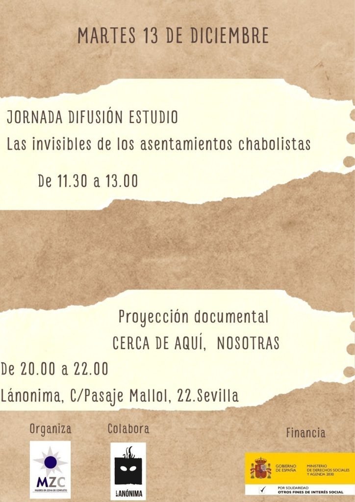 Por la tarde se presentará el documental «Cerca de aquí, nosotras», producto del estudio. Posteriormente, se realizará un coloquio. Será en Lanónima C/Pasaje Mallol, 22, Sevilla de 20:00 a 22:00h