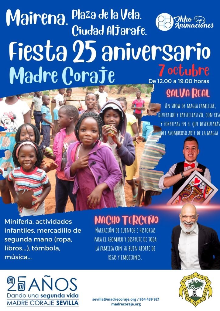 Madre Coraje celebra el sábado 7 de octubre, de 12.00 a 19.00 horas, en la Plaza de la Vela de Mairena del Aljarafe, en Ciudad Aljarafe, su Fiesta 25 aniversario que contará con actividades infantiles, una miniferia, mercadillo de segunda mano de ropa y libros, tómbolas, música… Además, la cita albergará a las 12.00 horas un show de magia familiar de la mano de Salva Real y, a las 13.00 horas, narración de cuentos e historias “para el asombro y disfrute de toda la familia con su buen aporte de risas y emociones” por parte de Nacho Terceño.