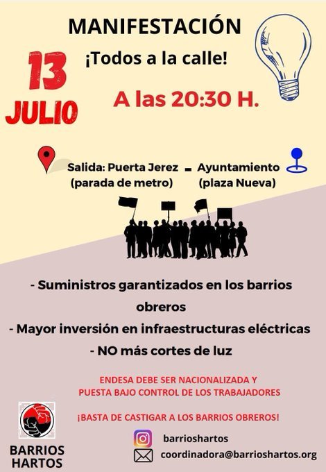 La coordinadora Barrios Hartos convoca una manifestación en Sevilla para solicitar suministros garantizados en los barrios obreros, mayor inversión en infraestructuras eléctricas y No más cortes de luz.