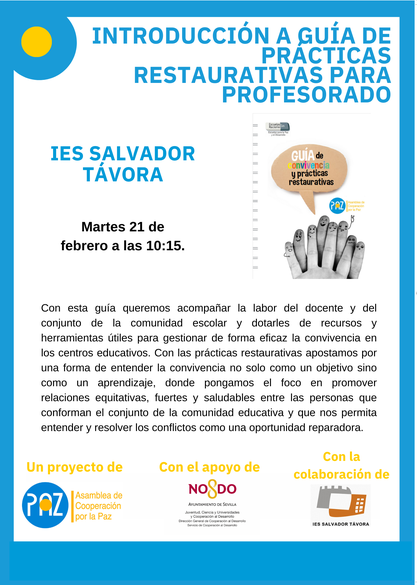 Asamblea de Cooperación por la Paz-Andalucía presenta la ‘Guía de prácticas restaurativas para profesorado’, una herramienta efectiva y eficiente para el cuidado de las relaciones humanas equitativas, sanas y resilientes entre personas que conforman las comunidades educativas.
