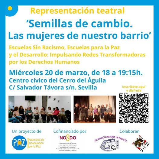 Esta actividad se enmarca en el proyecto “Escuelas Sin Racismo, Escuelas para la Paz y el Desarrollo: Impulsando Redes Transformadoras por los Derechos Humanos” que realizamos desde Asamblea de Cooperación por la Paz – Andalucía, con cofinanciación del Ayuntamiento de Sevilla y la colaboración de la Asociación Mujeres de Palmete y de Hijas Del Alba Teatro.
