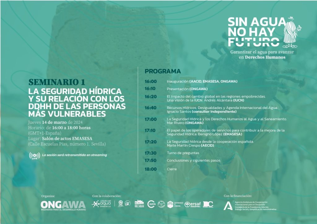 El próximo jueves 14 de marzo, de 16 a 18 horas (CET) (hora Madrid), tendrá lugar el seminario «La seguridad hídrica y su relación con los Derechos Humanos de las personas más vulnerables«, organizado por ONGAWA, en el Salón de actos de EMASESA (Calle Escuelas Pías, nº1. Sevilla).