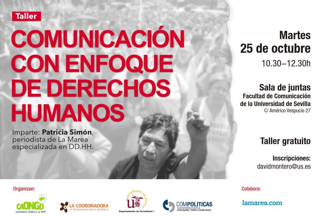 La CAONGD, en colaboración con La Coordinadora de Organizaciones para el Desarrollo, el Departamento de Periodismo I de la Facultad de Comunicación de la Universidad de Sevilla y ComPolíticas, además de lamarea.com, celebra el próximo 25 de octubre el taller Comunicación con enfoque de derechos humanos, que dinamiza la periodista Patricia Simón.