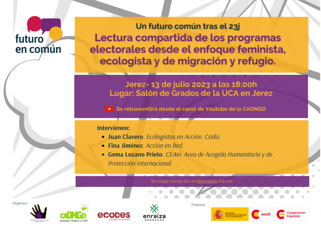 En el marco del encuentro Un futuro en común tras el 23J, que se desarrollará en Jerez (Cádiz) el próximo 13 de julio en horario de 10:00 a 20:00 horas, os invitamos a sumaros a la lectura compartida de los programas electorales desde el enfoque feminista, ecologista y de migración y refugio, actividad que tendrá lugar desde las 18:00h y que también se retransmitirá por el canal de Youtube de la CAONGD (https://youtube.com/@CAONGD/streams).