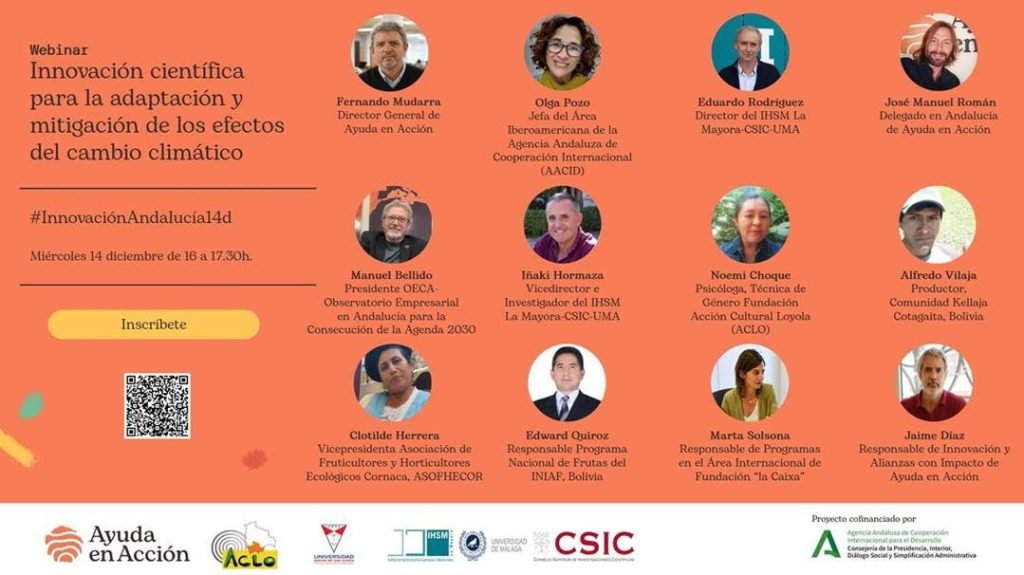 Ayuda en Acción y el IHSM-La Mayora-CSIC-UMA, con la colaboración de la Agencia Andaluza de Cooperación Internacional (AACID), organizan el WEBINAR: “Innovación científica para la adaptación y mitigación de los efectos del cambio climático” que tendrá lugar el próximo miércoles 14 de diciembre de 16 a 17.30 horas (horario en España)”.