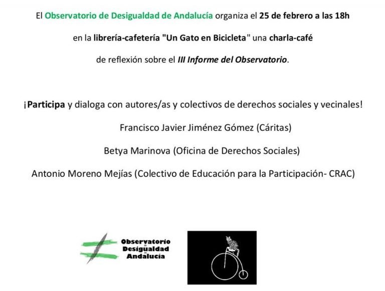 El Observatorio de Desigualdad de Andalucía organiza el 25 de febrero a las 18 horas en la librería- cafetería Un gato en bicicleta una charla … Leer más