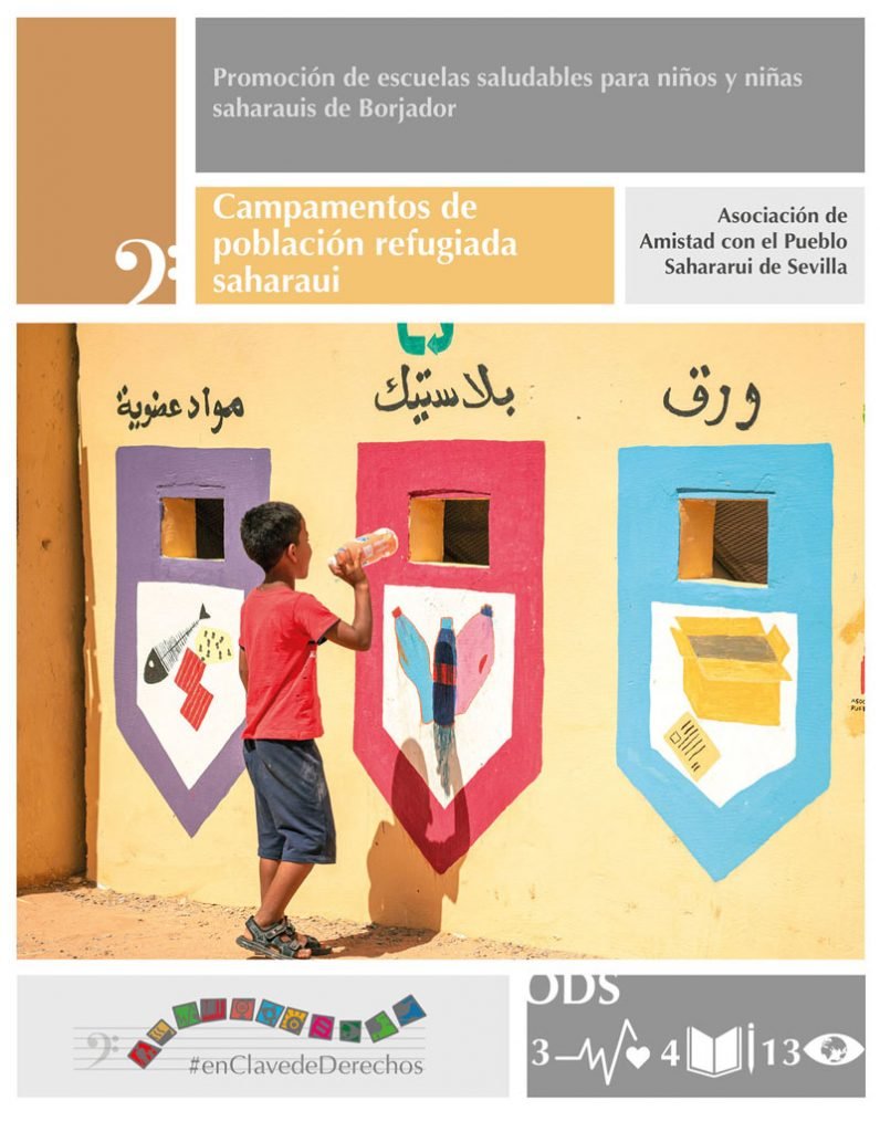 Este proyecto tiene como objetivo garantizar a niñas y niños saharauis de Borjador el derecho a una enseñanza básica de calidad en un entorno escolar equitativo, seguro y saludable. Esta imagen muestra los sistemas de contenedores montados en una de las escuelas donde se actuó. Estos contenedores tienen la intención de fomentar el reciclaje en las escuelas, promoviendo el cuidado del medio ambiente.