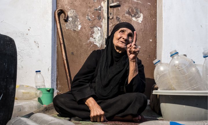 “La vida era fácil en el pasado. Educábamos a nuestros hijos y teníamos una vida sencilla. Era mejor que hoy en día. Cuando yo era joven teníamos más. Comíamos cuatro piezas de pan al día. Ahora como una cada tres días. Tenía una cisterna que me proveía agua, pero fue destruida. Después tenía que llenar todas estas botellas que veis a mí alrededor, en la casa de mi hijo, arriba, porque el agua de la red solo viene cada 10 días y, mientras tanto, dependía del agua almacenada en las botellas. Ahora tengo un tanque de agua en el tejado y hasta agua en el lavabo.”
