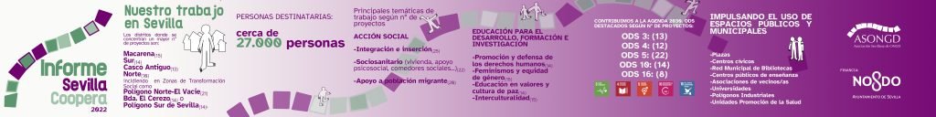 Esta primera aproximación al conjunto de actores de cooperación en Sevilla y al trabajo de las asociadas de la ASONGD, se inscribe en el marco del proyecto Sevilla Coopera VI que la Asociación Sevillana de ONGD desarrolla con la financiación del Ayuntamiento de Sevilla, a través de su Servicio de Cooperación a Desarrollo.